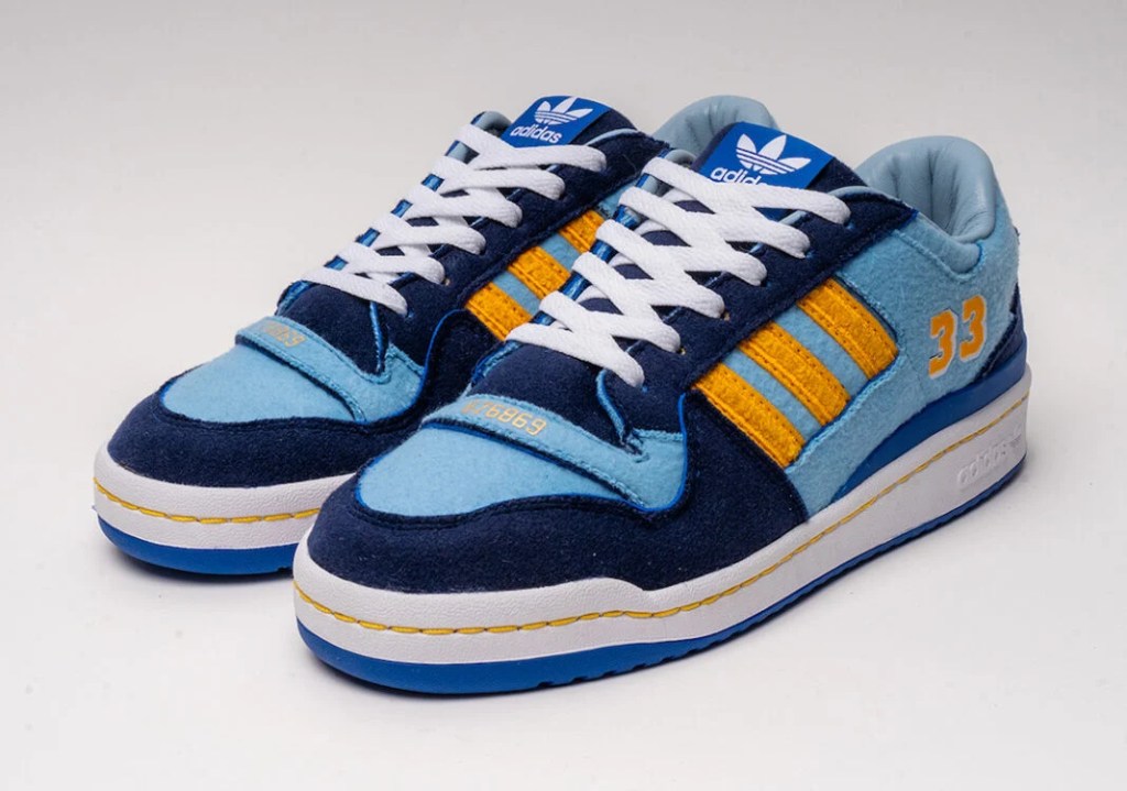 Les adidas Forum Alpha, vêtue de bleu et d’Or, s’inspirent de la carrière Lycéenne de KAJ.