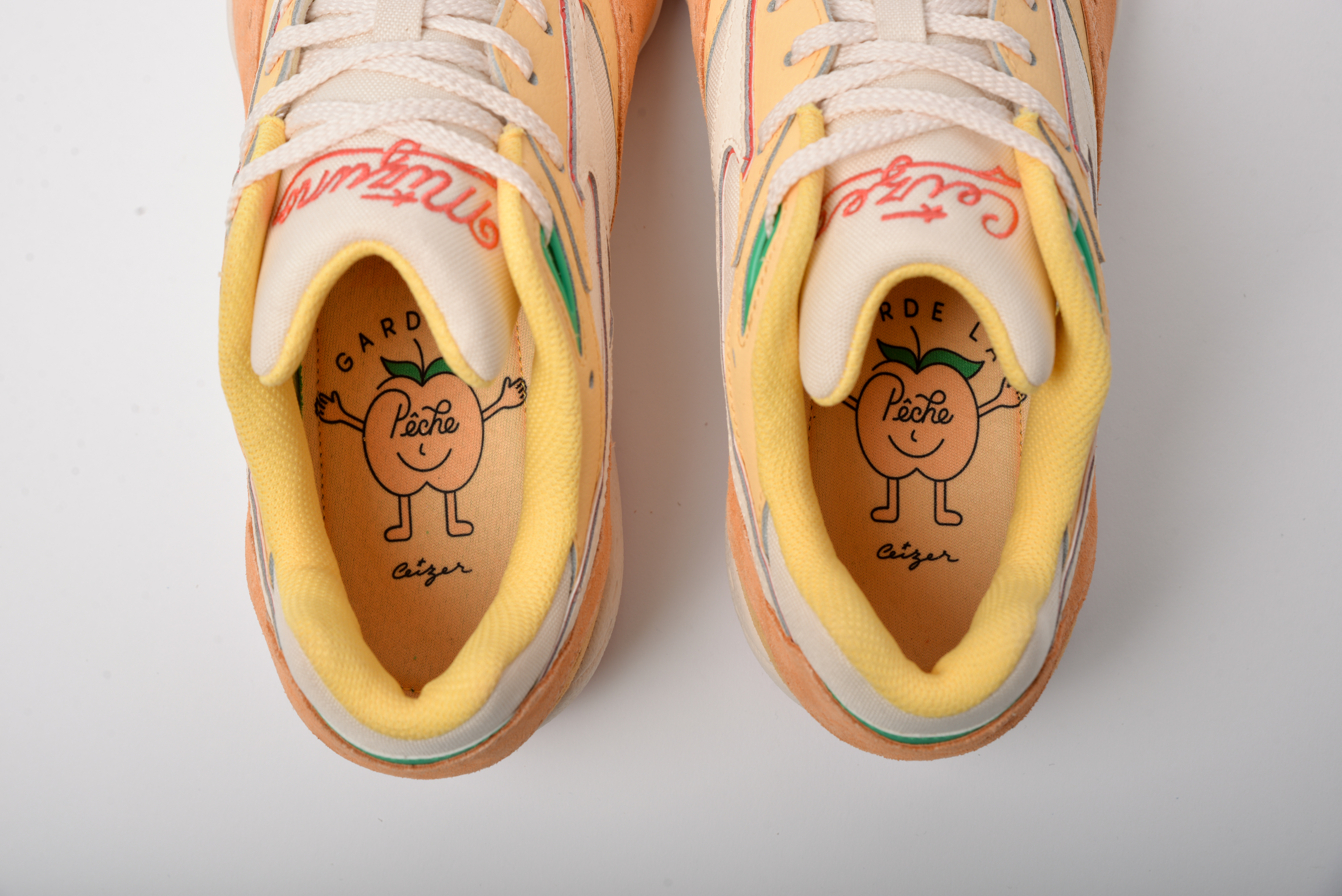 Le nom du modèle est aussi un hommage à la langue Française. Cette expression bien connue (coucou Booba) est aussi, via le fruit, un rappel de saison, la pêche étant également une inspiration colorielle du modèle, et aussi, logiquement, de la campagne marketing qui accompagne cette sortie.