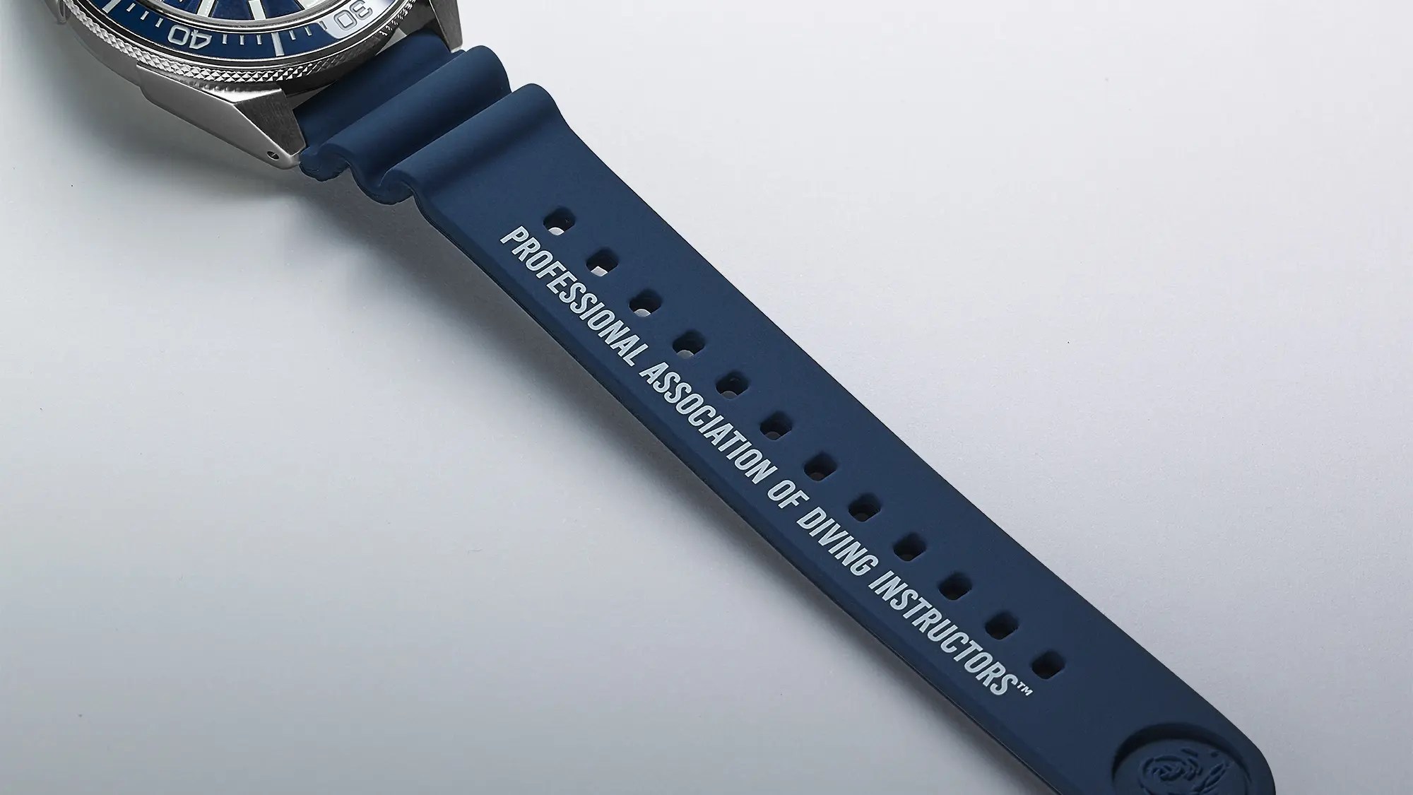 Bien évidemment, le cadran est inspiré par la vue depuis les profondeurs des plongeurs, avec le soleil qui se réfléchit sur la surface de l’eau. Sur le bracelet en silicone, on retrouve en impression « Professional Association of Diving Instructors », de quoi souligner encore la collaboration pour cette montre Seiko.