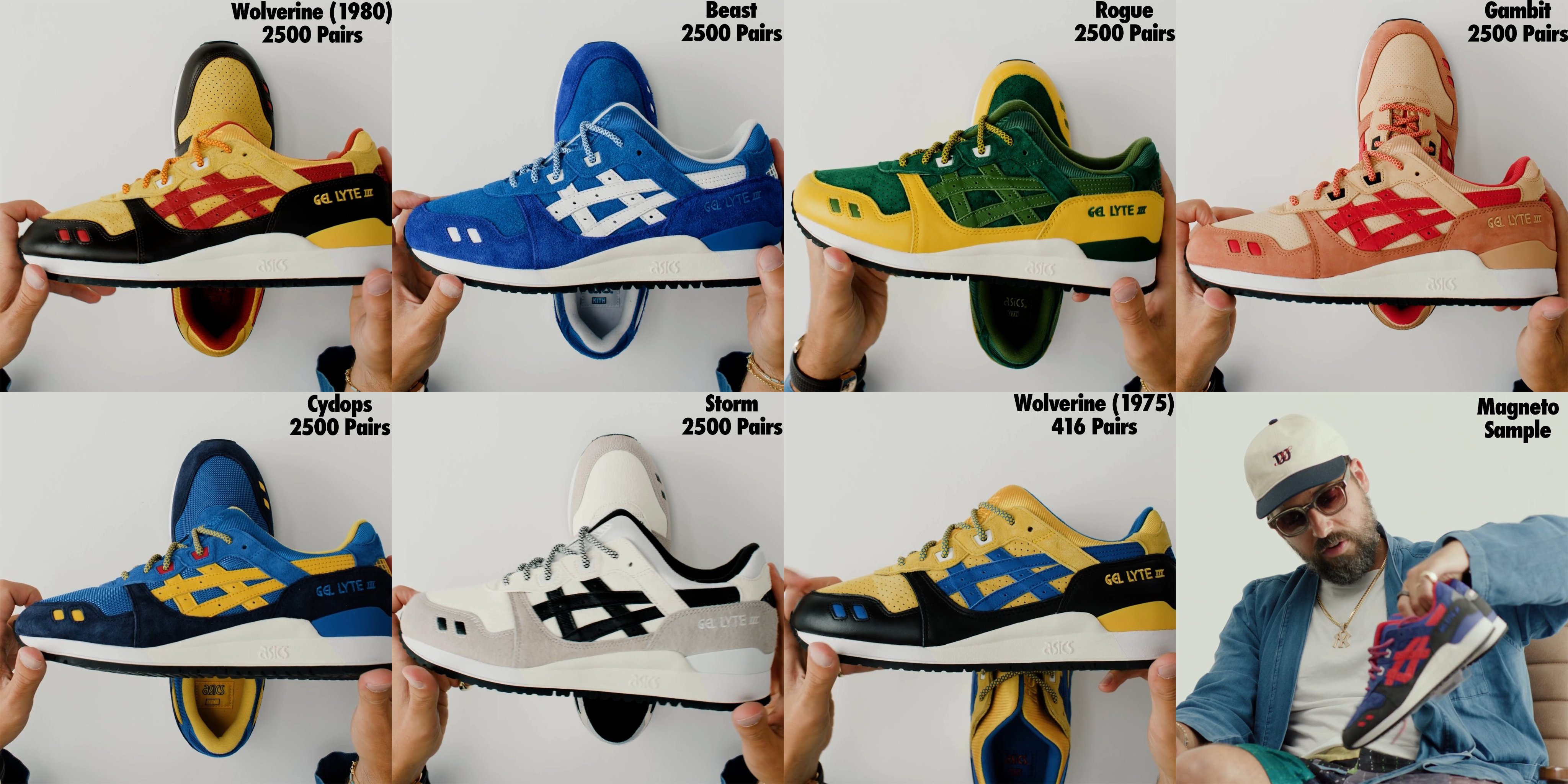 Toutes les paires sont sur le même modèle, les Asics Gel Lyte III, qui sont une référence de confort dans le monde de la sneakers. Chaque personnage a son modèle qui reprend les couleurs de son costume, ou de l’un d’entre eux en tout cas, avec en plus une étiquette dans la paire pour rappeler le nom du personnage.