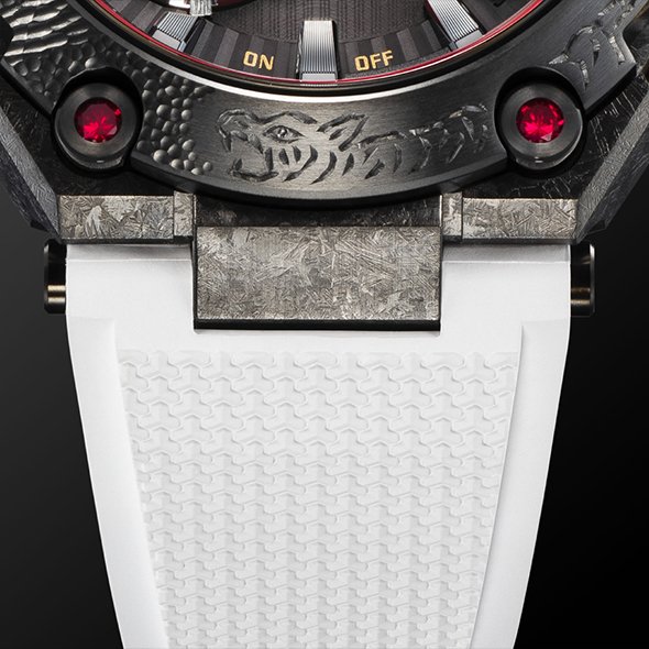 Détail supplémentaire, le symbole du tigre, issu de l’emblème samouraï, est gravé avec précision sur la lunette de la montre par le maître métallier KOBAYASHI Masao. Un détail de plus sur cette montre qui multiplie la finesse dans son design. Autre rappel aux armures métalliques des Samouraïs, le boîtier de la montre est en titane argenté.