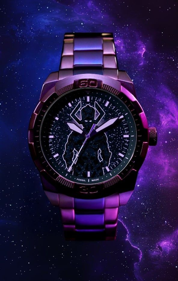 Chez Fossil, par contre, on ne s’est pas loupé. La montre à l’air top, avec le coloris violet représentatif du méchant, et sa forme en fond de cadran. Le dos du boîtier est complètement fou lui aussi, avec un dessin de Galactus issu de ses épopées dans les Comics Marvel.