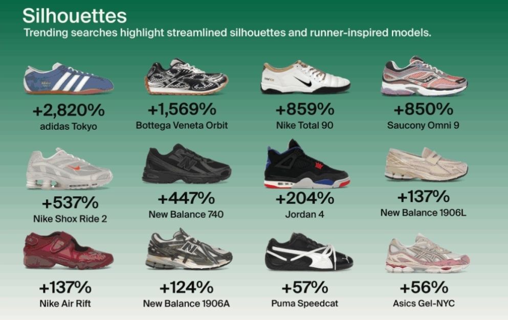 Dans cette infographie, on découvre les modèles qui ont connu la plus forte hausse de popularité. On remarque beaucoup de modèles similaires, des adidas Tokyo aux Puma Speedcat, mais aussi les Loafers New Balance, preuve d’un vrai gros changement de tendance.