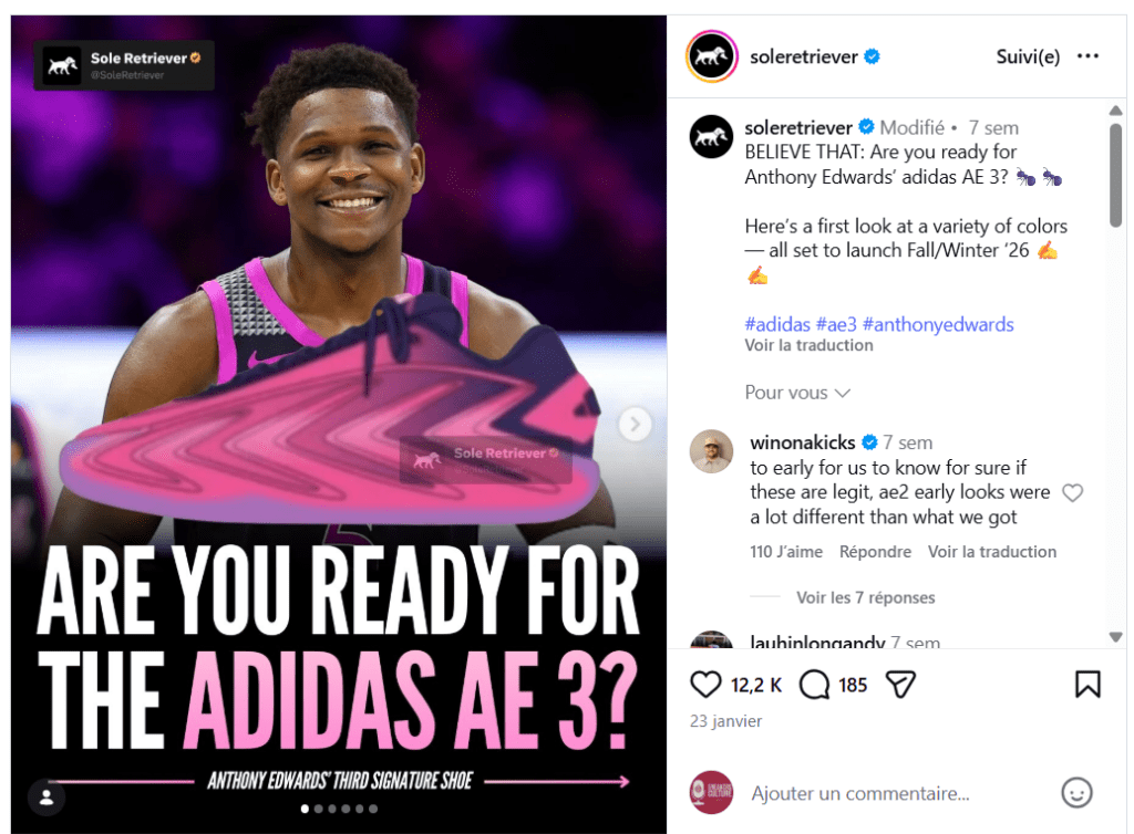 Adidas a déposé une plainte contre le site d’information Sole Retriever. En cause, une accusation de tentative d’extorsion, sur fond de photos volées du prochain modèle d’Anthony Edwards. Sortez les pop-corns, je vous raconte tout ça !